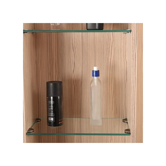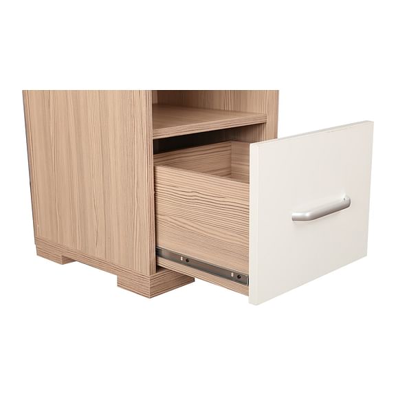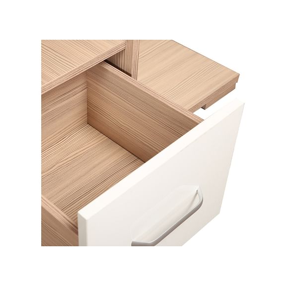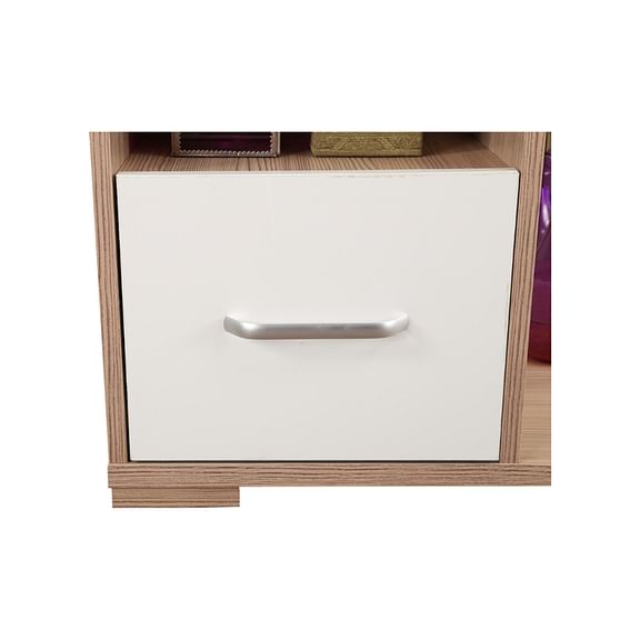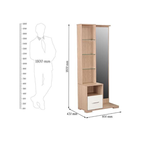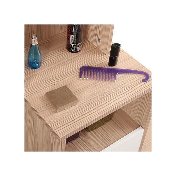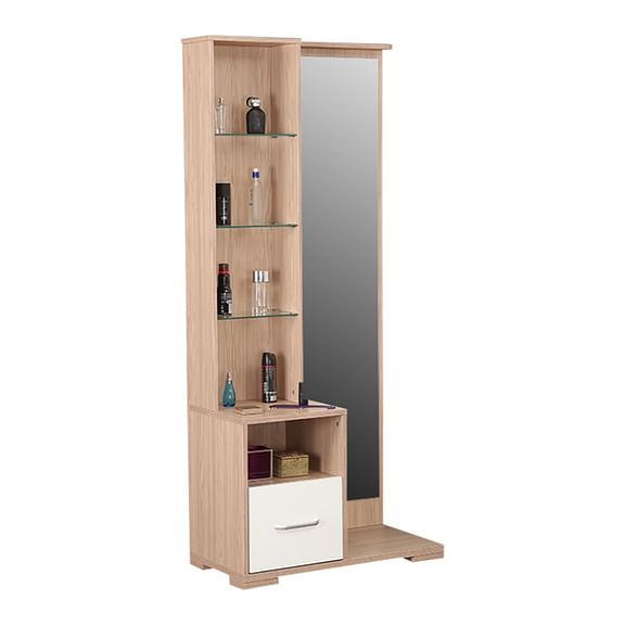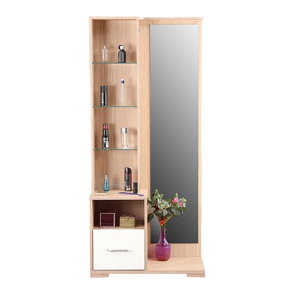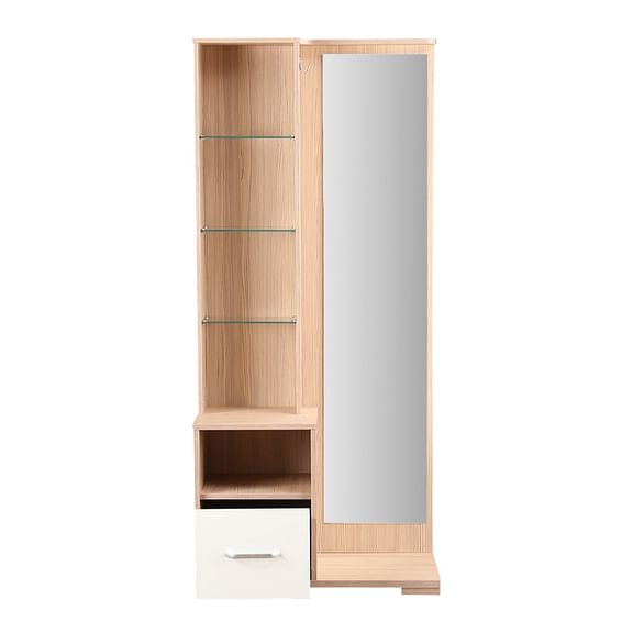 The oak-colored Ambra dresser with full length mirror and natural wood grain finish breathes freshness with its light texture and modern silhouette. The distinct high gloss white drawer shutter with leveled shelf space and attached hooks, makes this a highly functional pick.
