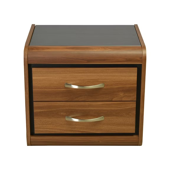 The modern classic Archer nightstand has a tonal natural wood grain finish over engineered wood and soft rounded corners. Black tinted glass top inlayed with two drawers storage capacity makes it a good pair for a bed.