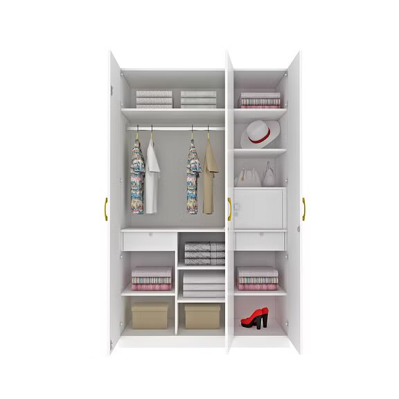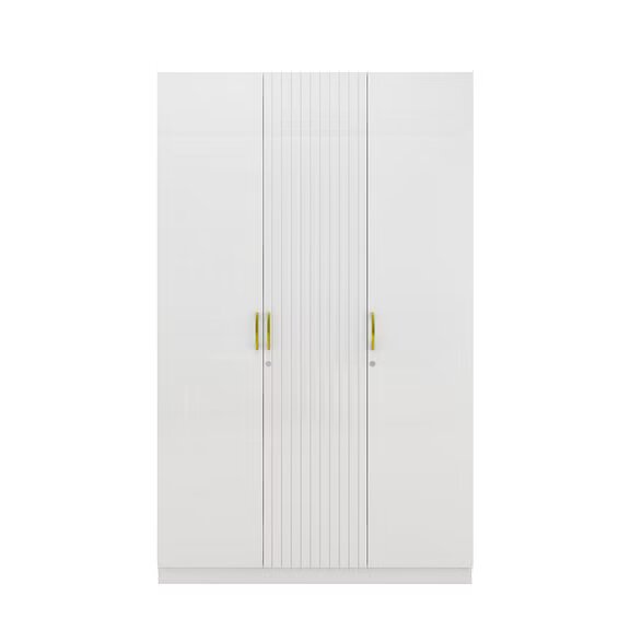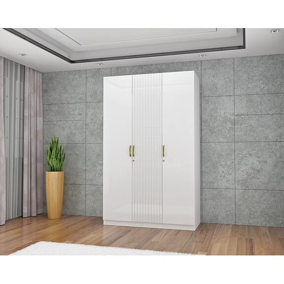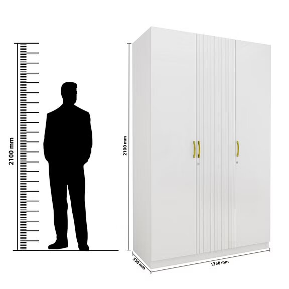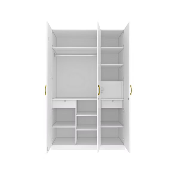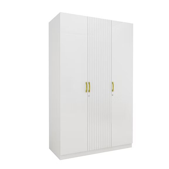 The all-white Minerva three door wardrobe with accent fluted door and gold handles is modern looking and elegant. Thoughtfully designed storage spaces with ergonomic fittings makes the wardrobe extremely functional. Perfect addition to the Minerva bedroom set